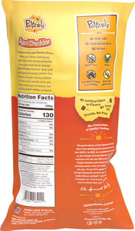 This Bold and Savory Aged Cheddar Cheese Flavor gives these deliciously Vegan snacks their cheesy perfection as we packed that flavor onto our Light yet Crunchy Puffzels. Made with whole grains but totally Gluten-free, Puffzels are your trusty sidekick for that snack attack when you need a taste bud tantalizing, but not filling, Flavor-packed wingman.