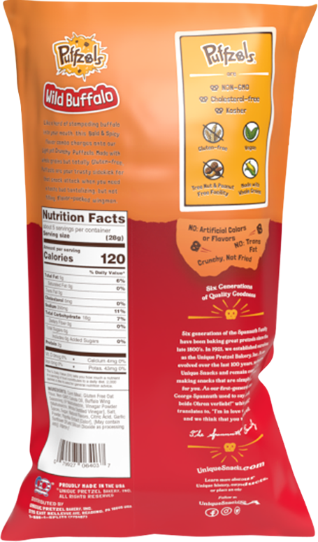 Like a herd of stampeding buffalo into your mouth, this Bold & Spicy flavor combo charges onto our Light yet Crunchy Puffzels. Made with whole grains but totally Gluten-free, Puffzels are your trusty sidekick for that snack attack when you need a taste bud tantalizing, but not filling, Flavor-packed wingman.